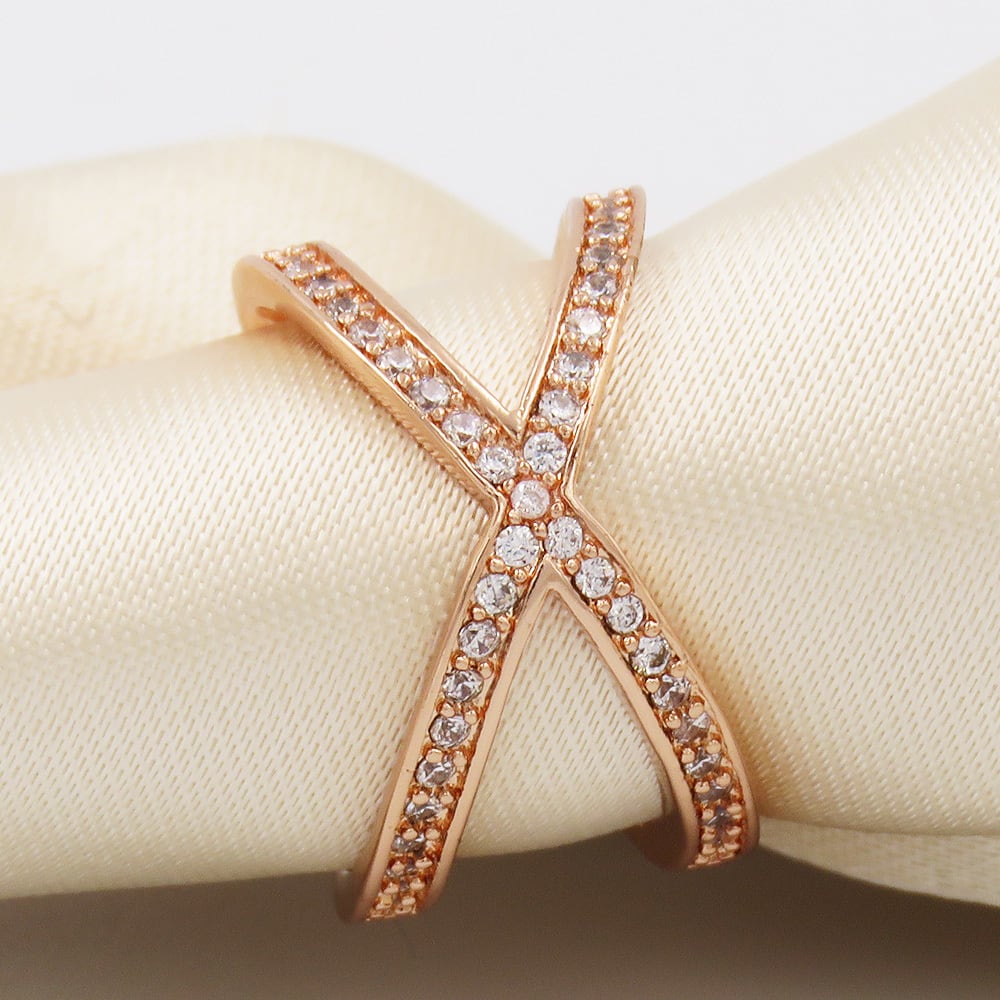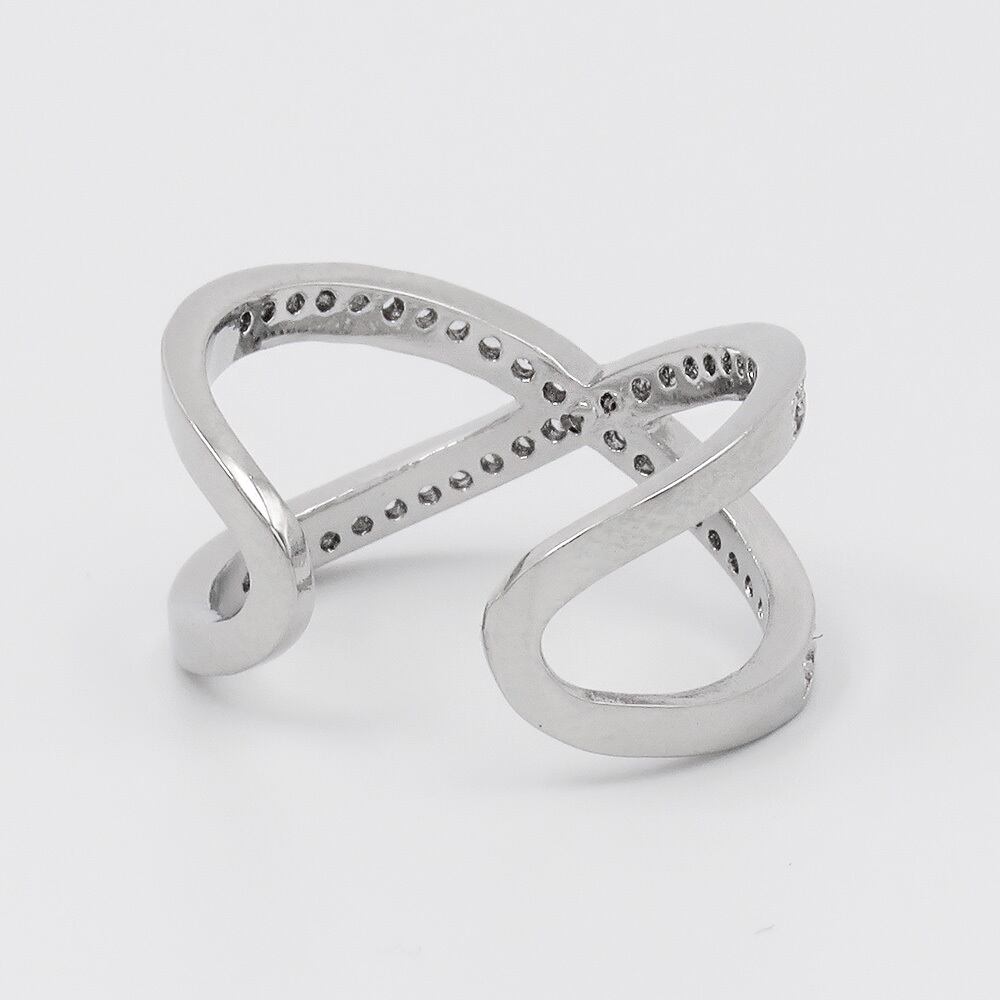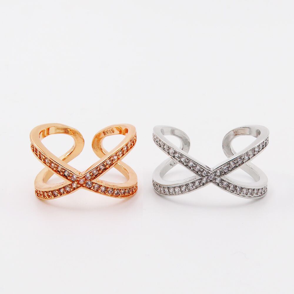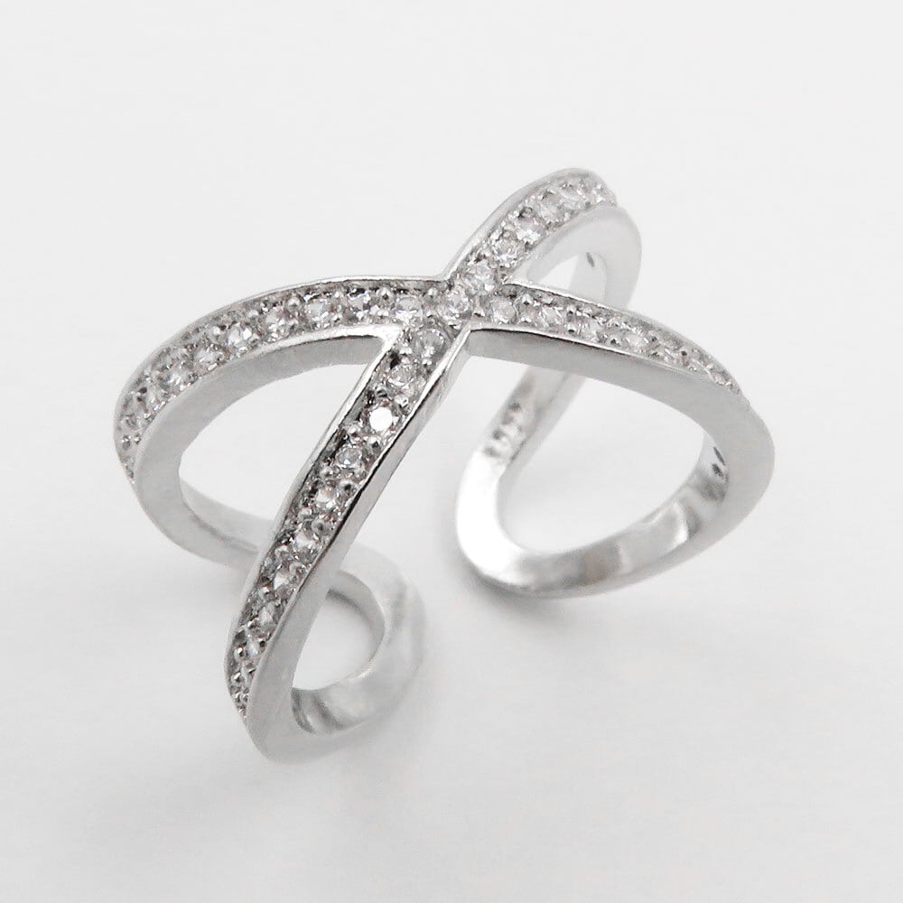 【Qroza】 クロスデザインリング レディース フリーサイズ オープンリング Xライン パヴェ風 ストーン エタニティ ピンキーリング 上品 華奢 指を細く見せる きれいめ シンプル 高見え 重ね付け風 フォーマル 結婚式 女性用 アクセサリー ポーチ プレゼント