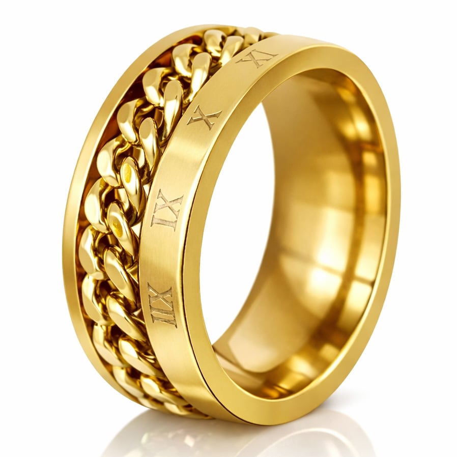 【Qroza】指輪 メンズ リング 喜平チェーン ローマ数字 360度回転 ハンドスピナー ステンレス アクセサリ ポーチ付 クロス付 かっこいい 高級感 モテる ジュエリー デザイン トレンド 人気 高見え ファッション シンプル ペア プレゼント 記念日 誕生日 ブラック ゴールド シルバー